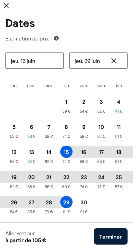 Aussi, si tu peux te permettre de partir et revenir un jour de semaine, tu trouveras certainement des meilleurs deals pour les transports et logements. Retourne voir mes astuces pour trouver les billets d’avion les moins chers pour plus d’infos!