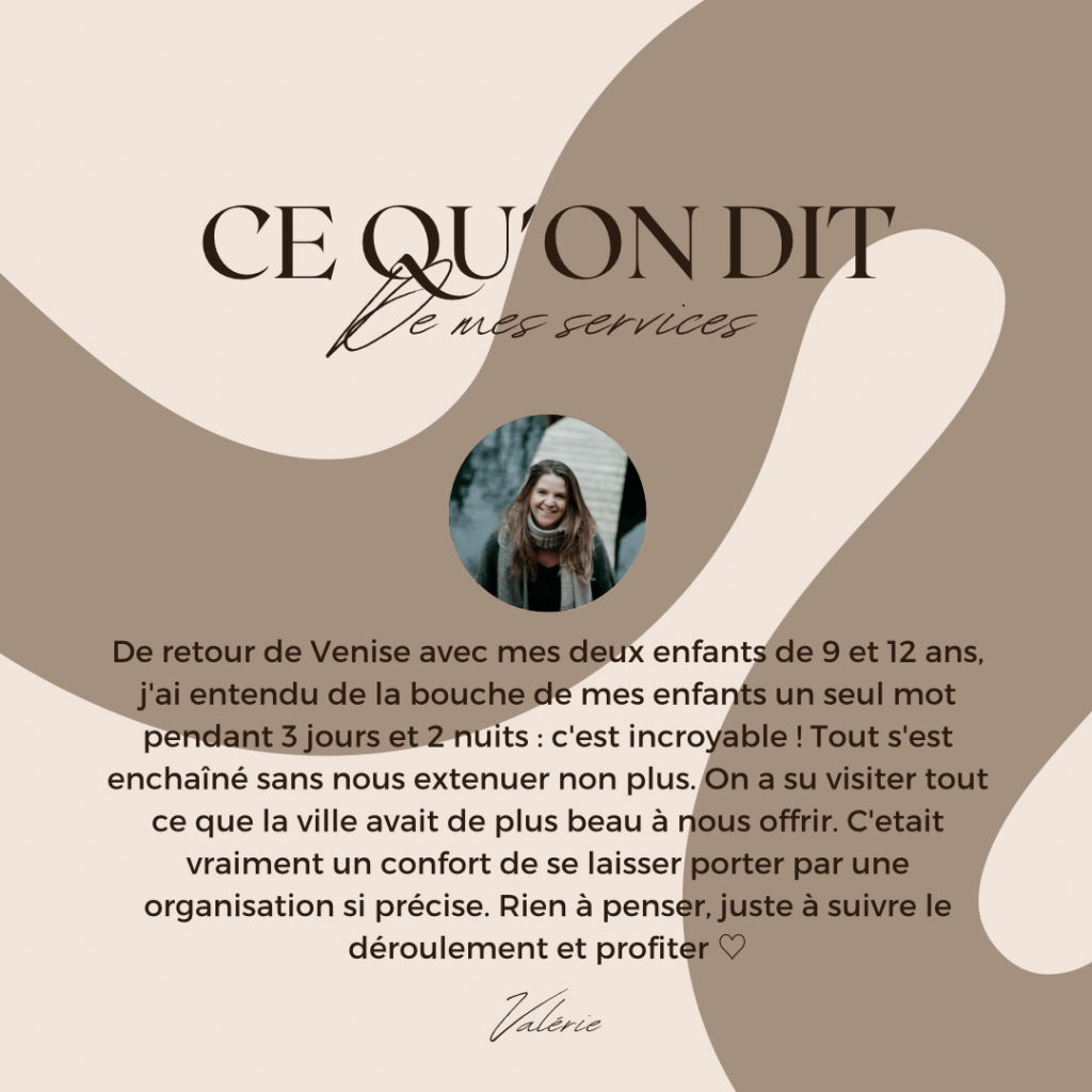 - Je vous accompagne dans les réservations des logements et activités que vous aurez choisi parmi ma sélection si vous le désirez. Mais c’est toujours vous qui réserverez logements, activités, transports, etc quelle que soit la formule choisie.